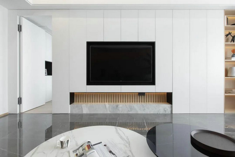 極具質(zhì)感的普佩斯中灰耐磨王大理石瓷磚、素雅木飾面、雪凈的純粹白墻,如此相配的組合在空間里舒展鋪陳。設計師在轉換視角時(shí)看見(jiàn)空間的延伸,引入自然光來(lái)活絡(luò )氣氛。