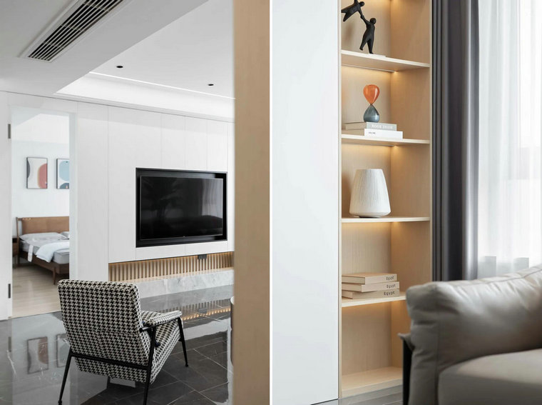 大理石元素、木飾面、藝術(shù)品的質(zhì)感細節融匯于自然光與紗簾打造的柔和濾鏡,空間語(yǔ)言以其獨有的方式傳達著(zhù)對愜意的理解。