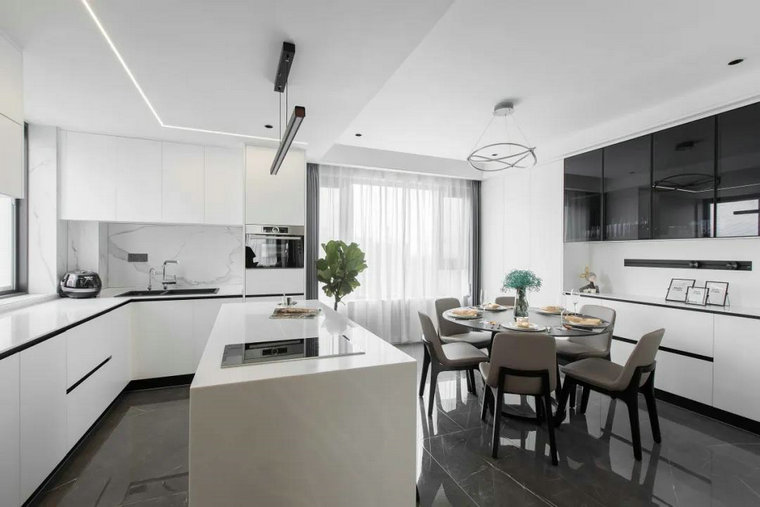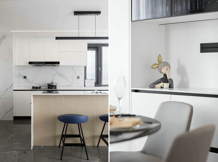 開(kāi)放式廚房與餐桌島臺圍合著(zhù)歸屬感,將空間之間的互動(dòng)性作為設計的出發(fā)點(diǎn)。普佩斯中灰耐磨王大理石瓷磚與卡拉拉白大理石瓷磚形成質(zhì)感和色彩上的呼應,極具棱角的簡(jiǎn)潔,是設計駕輕就熟的利落。