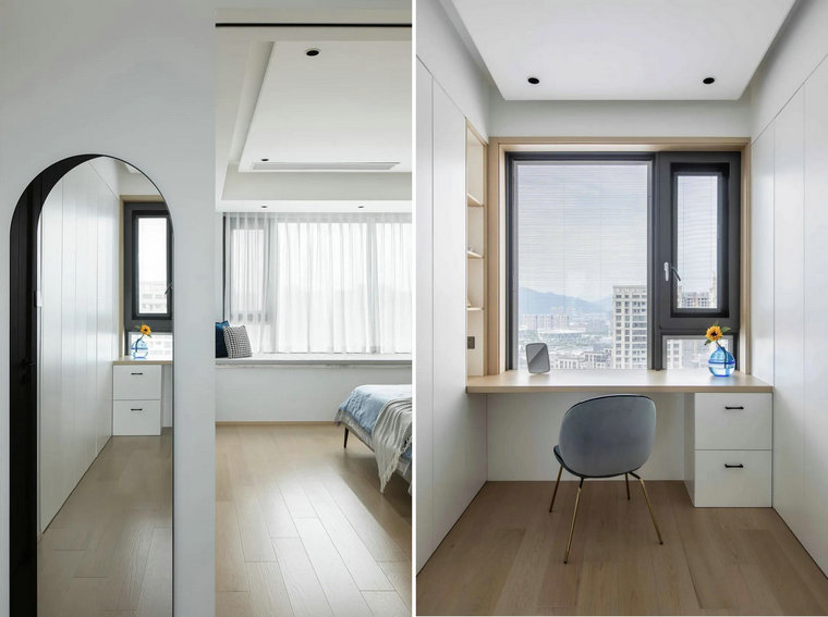 弧形鏡面,為空間鋪就視覺(jué)過(guò)渡。木面的紋理、柔和的色塊、器物的簡(jiǎn)粹,在空間秩序的微妙平衡中,張弛有度,回應內心安靜的思緒。簡(jiǎn)約,是細致入微。